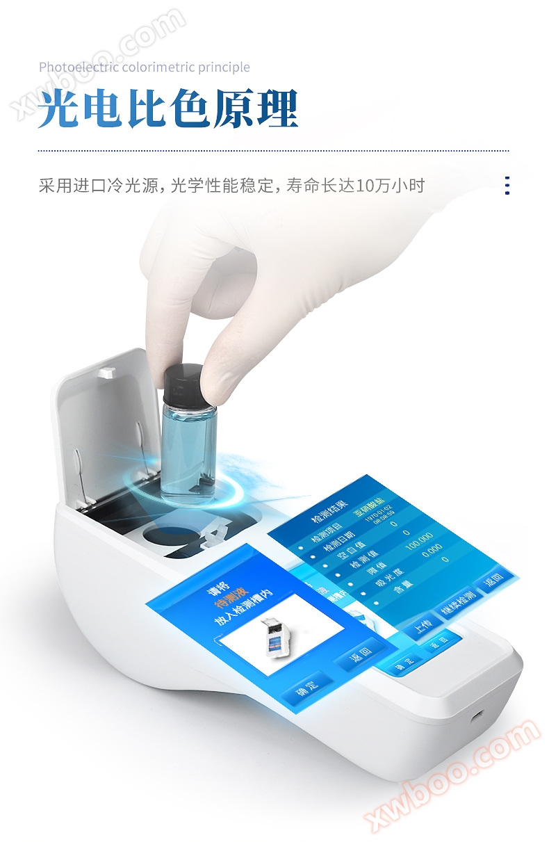Extract a certain amount of water sample, and after pre-treatment, drip the detection reagent according to the reagent instructions for different detection items. The detection reagent will react with the analyte in the water, and the reaction solution will present a specific color.