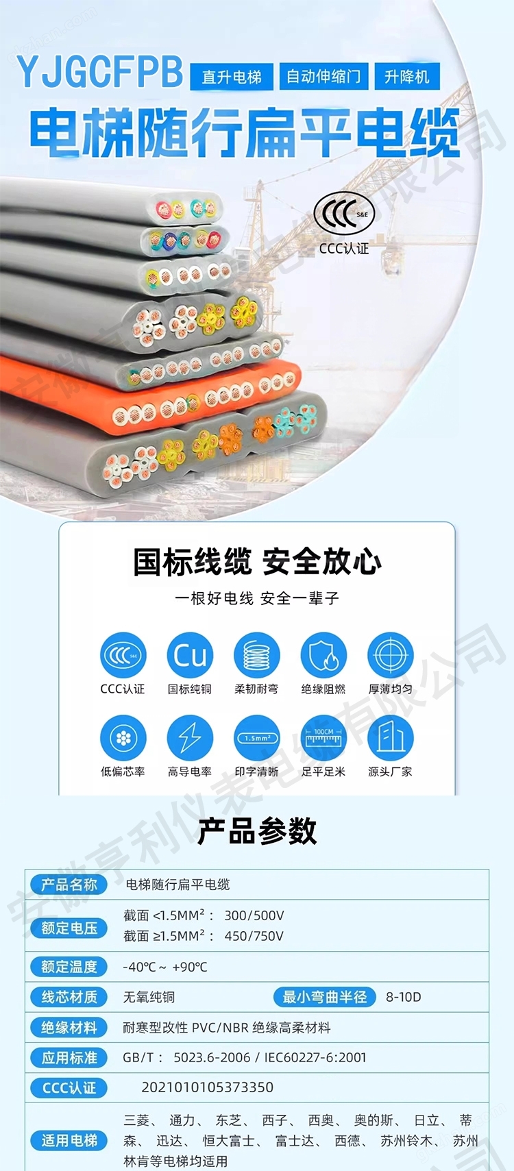 The long-term allowable working temperature for high-voltage flat cable conductors is 70 degrees for nitrile composites and 180 degrees for silicone rubber. The minimum bending radius of the cable is ten times the diameter of the short side of the cable. This product is mainly used for power connection and control signal lighting of various mobile power devices in industries such as transportation, machinery, electrical, mining, etc. The composition meaning of product varieties, specifications, and models for the YFFB series can be found in the markings on the surface of the cable. The ambient temperature for cable laying should not be lower than minus 40 degrees Celsius, the temperature for nitrile vinyl chloride polymer cables should not exceed 70 degrees Celsius, and the temperature for silicone rubber cables should not exceed 180 degrees Celsius. Cables should not be left in water for a long time, and nitrile chloride polymer cables should not be operated at high temperatures for a long time. The rated voltage of the cable should be greater than or equal to the rated operating voltage of the system. In a DC system, the standard voltage of the system should not exceed 1.5 times the rated voltage of the cable; The operating voltage of the system should not exceed one and a half times the rated voltage. During the process of cable laying and installation, abandoning materials does not have a negative impact on the environment. But abandoned items should be cleaned up in a timely manner. Technical characteristics: The single wire conductor is a bare copper conductor. The outer sheath rubber of the cable is made of butadiene vinyl chloride polymer or silicone rubber, which has the characteristics of heat radiation resistance, cold resistance, acid and alkali resistance, corrosive gas resistance, waterproofing, etc. P-type cable insulation has shielding function. The surface of the cable is smooth, without cracks, bumps, or sulfide particles. Cable laying and installation: Cable laying and installation should be undertaken by qualified personnel with practical work experience. Cable laying should be carried out using specialized equipment and tools that meet the requirements, such as pay off racks and guide wheels. The synchronous laying method can use end traction, mechanical transportation, and manual assistance guidance. Effective measures should be taken during cable laying to prevent scratches on the ground, trench walls, pipe openings, and machinery, ensuring the integrity of the cable during laying. During installation, cables are not allowed to twist. If any twisting occurs, it should be removed in the direction of the twisting. Cables cannot be directly buried underground or soaked in ditches. Precautions for cable transportation, storage, loading and unloading, preservation, and on-site placement. Product acceptance and inspection: After the product arrives at the destination, the user should conduct timely inspection and acceptance. When unpacking the product, the surface protective layer of the cable should not be damaged. Inspection content: Check whether the cable model, specifications, and length are consistent with the bill of lading. Check whether the surface of the cable is intact, whether there are cracks or other defects, whether the outer diameter of the cable meets the cable parameters, and whether the outer diameter is uniform. Is there any obvious deformation or distortion on the cable reel, and is the cable end capped. Product certificate, one copy for each plate and item, one quality assurance certificate, and if required by the user, one product user manual. The insulation material adopts high-strength wear-resistant nitrile composite insulation material, and the insulation should be continuously extruded on the conductor, with a smooth, round and defect free surface. The surface should be smooth, round, and defect free. Cable installation and precautions: Cable laying should not be twisted, that is, the cable should not be untied from one end of the cable reel. Instead, the cable reel should be rotated first to unfold the cable, and if necessary, the cable can be unfolded or hung up. Attention must be paid to the minimum bending radius of the cable. Both points of the cable must be fixed, or at least fixed at the moving end of the drag chain. The distance between the moving point of a general cable and the end of the drag chain should be thirty times the diameter of the cable.