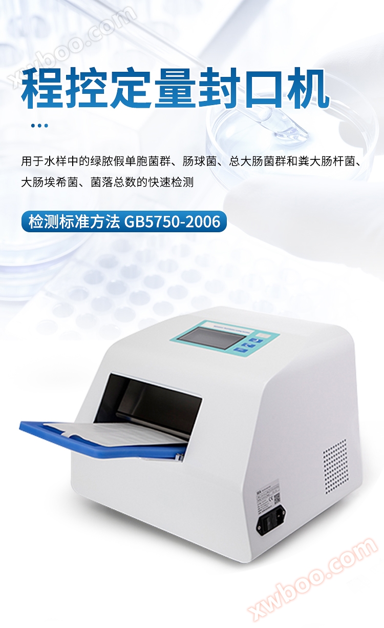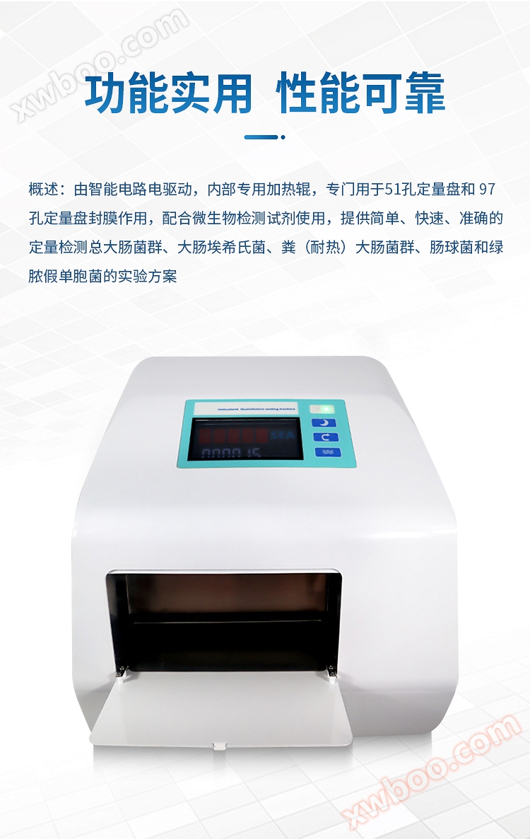 Hengmei Technology's programmable quantitative sealing machine is driven by an intelligent circuit and has a dedicated heating roller inside. It is specifically designed for sealing 51 well and 97 well quantitative disks, and is used in conjunction with microbial detection reagents to provide a simple, fast, and accurate experimental plan for quantitative detection of total coliforms, Escherichia coli, fecal (heat-resistant) coliforms, enterococci, and Pseudomonas aeruginosa; The 51 well quantitative disk and 97 well quantitative disk are semi-automatic quantitative methods designed based on the traditional Maximum Possible Number (MPN) statistical model, which can quantitatively detect water sample results. This method can replace and outperform traditional (membrane filtration, and multi tube fermentation) methods for detecting microorganisms in water.