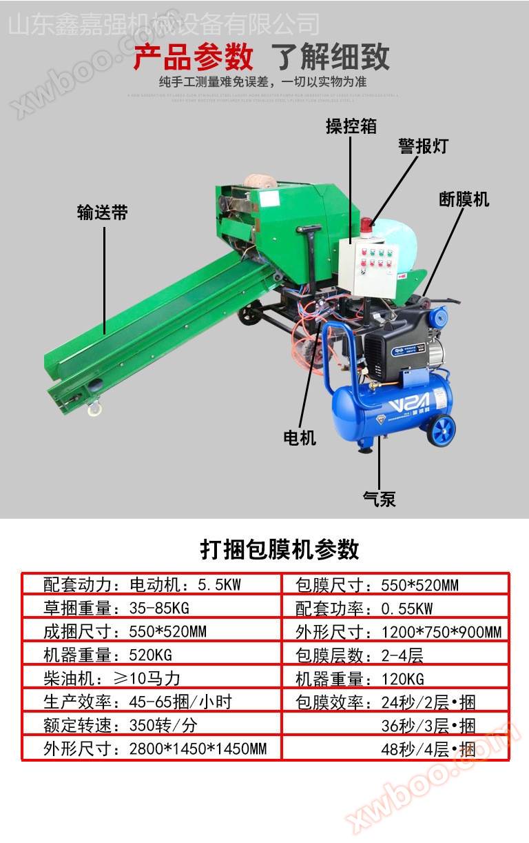 (Warm reminder: Xinjiaqiang Machinery's bundling and coating machine can be customized with hemp rope or bundling net according to customer needs. Our company also produces and sells various sizes of grass film, hemp rope, and bundling net. For specific model differences, please feel free to leave a message or call for consultation. Contact number: 13355110836 WeChat account.)